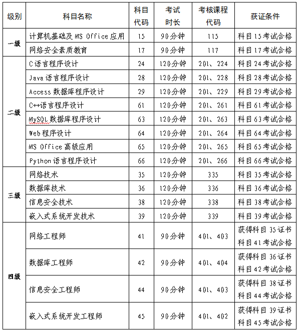 四级科目获证条件:四级科目成绩达到合格线,并已经或同时获得三级相关证书。