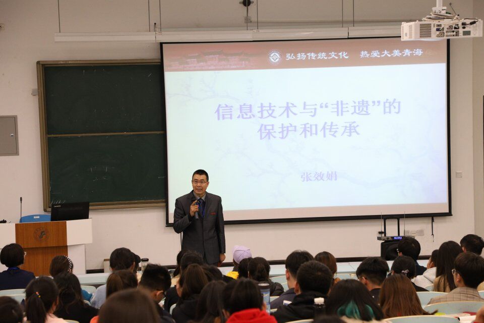 讲座中,张老师从“非遗”的概念、分类、价值、青海本土的“非遗”项目及信息技术与“非遗”的关系等几个方面,通过舞蹈、绣品、美术、医药、民俗等的直观展示,让同学们对“非遗”有了更加深刻的认识。同时,通过对生态性保护、抢救性保护、数据手套等的讲解,使同学们对保护“非遗”的基本制度和方法有了初步的了解,也使大家认识到信息技术参与“非遗”保护和传承的重要性。