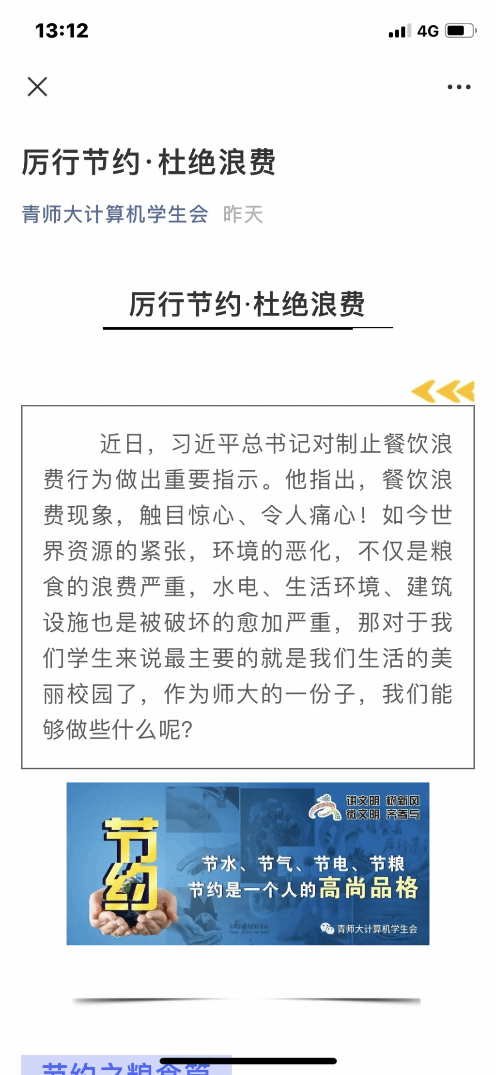 为了在全院形成“节约粮食、人人有责、人人有利”的良好氛围,让节约成为一种自觉,让光盘成为一种习惯,公司还通过制作专题宣传画、微信公众号推送倡议书等方式,强化宣传引导,让广大师生自觉做厉行节约的践行者、文明餐桌的维护者、美好生活的创造者,让节约成为一种校园新风尚。