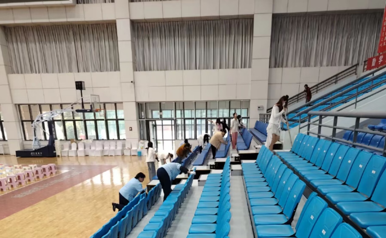 劳动中员工分成若干小组,一部分负责体育馆区域的卫生打扫,一部分负责操场区域垃圾捡拾。大家带着抹布、水桶、扫把等清洁工具,认真擦拭体育馆座椅,将操场内烟头、纸屑、塑料瓶等垃圾捡起。尽管天气炎热,但同学们脸上依旧洋溢着热烈的笑容,打扫工作紧张而有序的进行着。