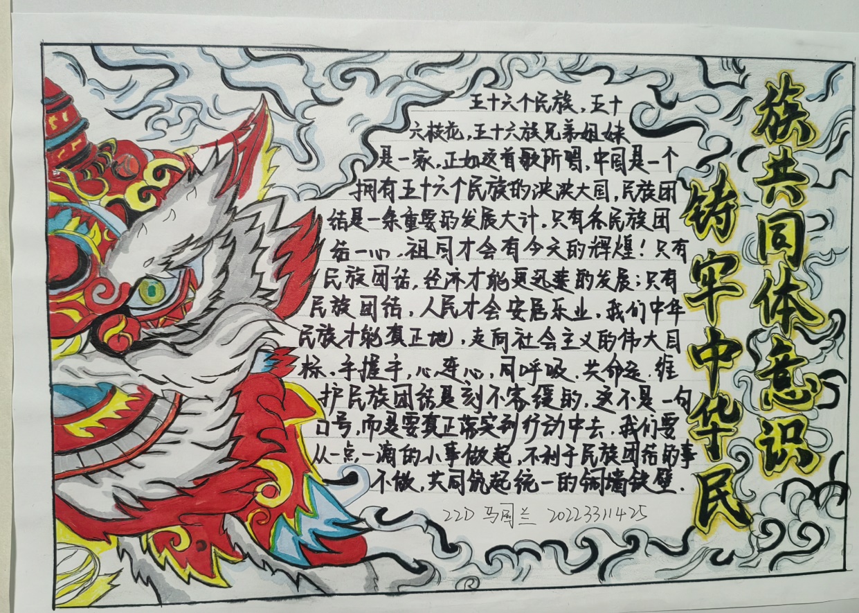 活动中,同学们屏气凝神,一笔一划,认真细致,以青春为笔,浓情为墨,抒发了各民族之间团结友好的情谊,彰显了新时代青年刚健有为的精神风貌。一幅幅色彩鲜艳、主题鲜明的作品呈现在大家眼前。不仅展现了同学们扎实的师范生技能,更传递出对民族团结的深刻认知和对伟大祖国的热爱之情。