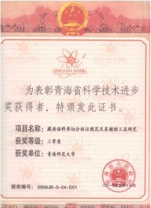 本学科方向经过30多年的发展,主要成员先后完成国家“863”计划项目2项,国家自然科学基金4项、社科基金2项,省部级项目39项;参与制定藏文信息处理国际标准1项和国家标准6项,在藏文字库、输入法、藏语语料库切分标注规范及其辅助工具等方面取得研究成果8项。其中,“藏文计算机键盘和输入编码方法研究”于2004年获国家科技进步二等奖;“玛钦藏文平台、字库及藏汉英电子字典”于2009年获青海省科技进步一等奖;另获青海省科技进步二等奖2项、三等奖1项、钱伟长中文信息处理科学技术奖1项。目前本学科方向主持国家自然科学和社会科学基金项目12项、省部级项目11项,主持项目经费达500余万元;参与973前期研究专项1项、教育部“长江学者与创新团队发展计划”项目1项;SCI/EI检索及核心期刊发表论文30余篇;授权国家发明专利1项。